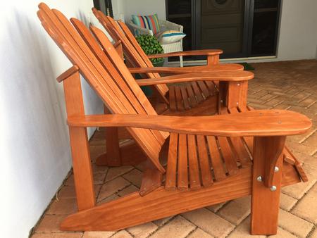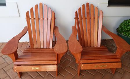 The chairs above are made of pine. Each piece (28 in total) is hand-cut, then rounded with belt and palm sanders plus hand-sanding, then stained and triple-coated with a marine-grade varnish for maximum protection. The chairs are light weight and look luxurious in any environment. They can be custom-named as in the above samples which were ordered for a birthday gift. They can also be custom-colored according to your desire.